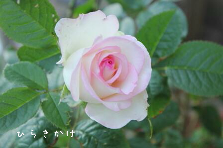 オフホワイトの花びらぎっしりのカップ咲き、中心がほんのり桜ピンク。